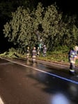 Kurz danach rückten 4 Fahrzeuge mit 16 Mitgliedern Richtung Tiefenbach aus. Mittels Seilwinde wurde ein umgestürzter Bau von der Straße entfernt. Die anderen konnten wir mit der Motorkettensäge zerkleinern und Sie an den Straßenrand befördern. Kurz nach 23 Uhr konnten wir wieder ins Feuerwehrhaus einrücken und die Einsatzbereitschaft herstellen.